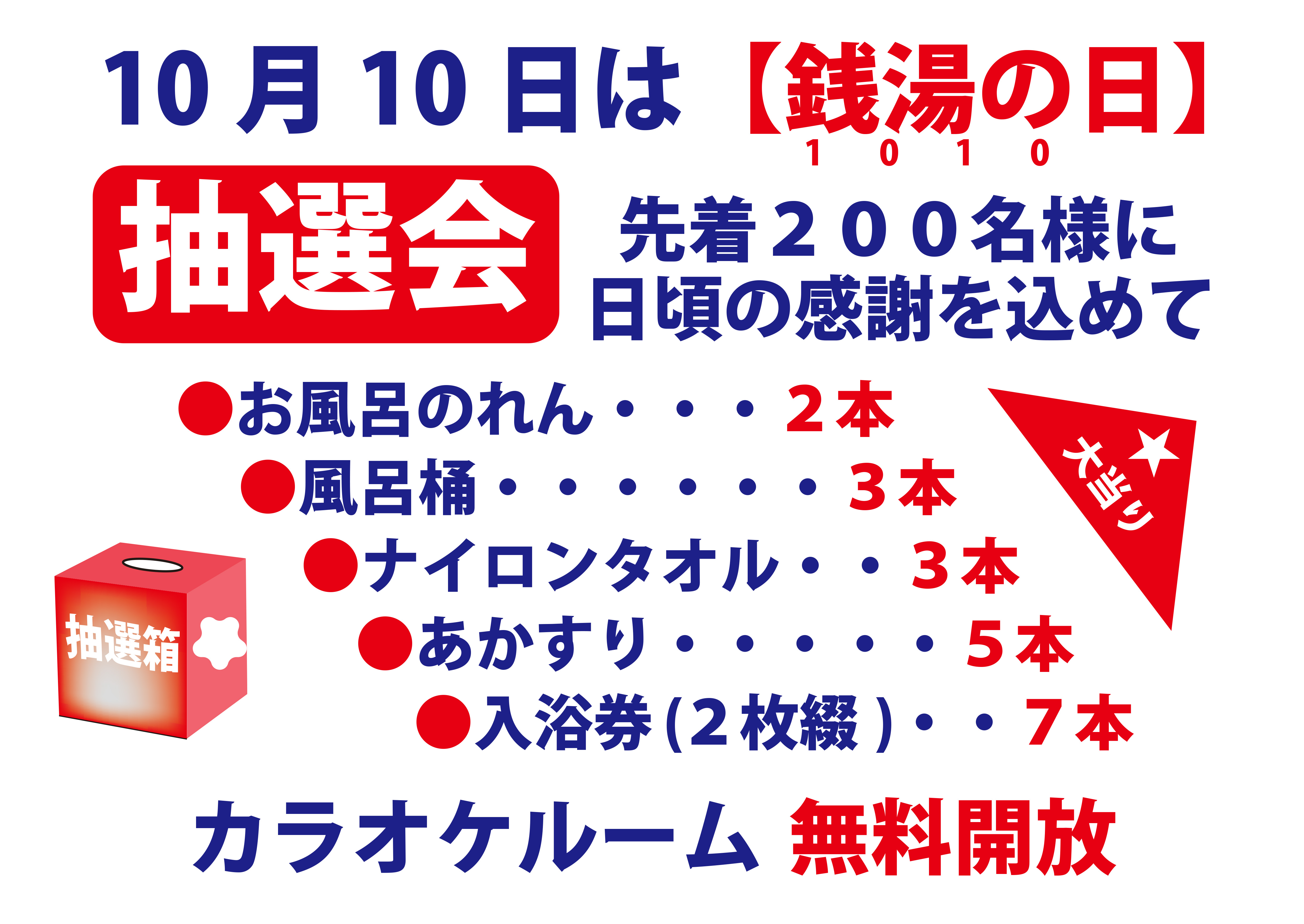 10月10日は語呂合わせで1010【銭湯の日】です。